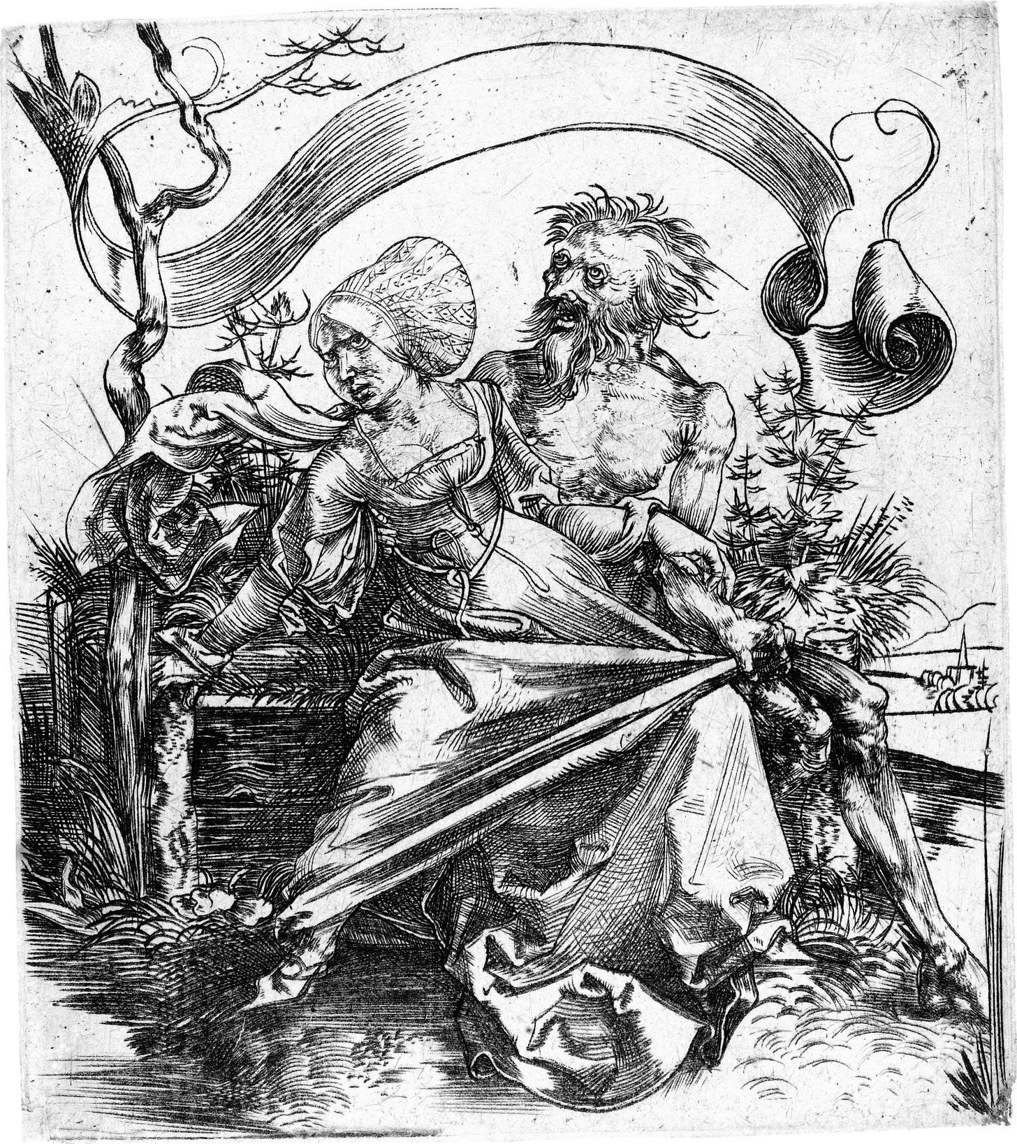 Some ten years later his first engravings appear (1495). Let’s take the hideous one called The Ravisher (it’s a metaphor for time). There’s no easy way of saying this, but the engraving is full of mistakes. Focus your attention on the big empty ‘banderole’ (banner) at the top of the image. You can see two tendrils coming off teh top right hand corner. One of them has this weirdly long straight section. That’s where Dürer, one of the greatest artists of all time (and specifically, one of the greatest graphic artists of all time) lost control of his tool.