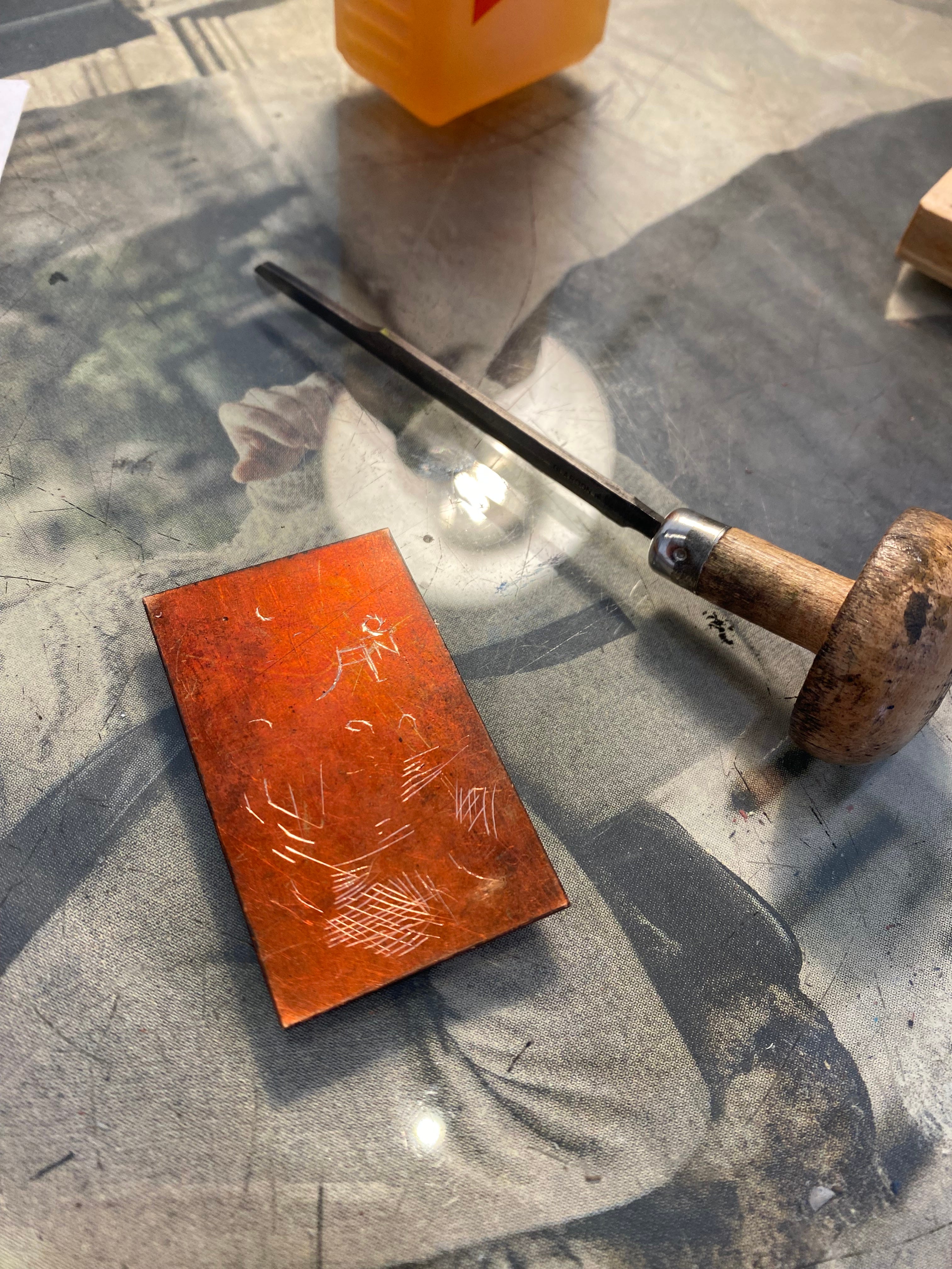 Then we were ready to start cutting lines into the plate, but I had to transfer my design first. We used a kind of grease chalk on the inverse of my (photocopied, ironically) design and impressed it through. It produced an extremely faint image. This was a drawback of engraving that I had never imagined. Because there is no pitch black ground (and one that will take graphite or chalk), you have a copper coloured shiny surface that nothing really wants to stick to, because it’s metal. So the very first step is much harder.