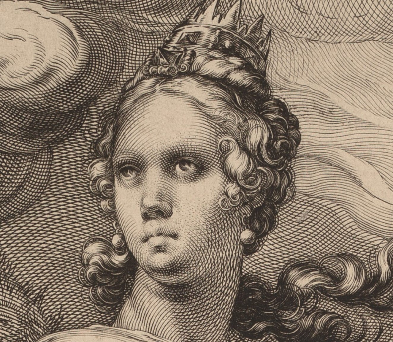 Look at the earrings. They are tiny spheres made of extremely tight circles. Earrings are almost everywhere in Goltzius’ engravings; just as weird unexplained spheres turn up all over the place in Dürer’s mature engravings. Now I know why. It’s a flex, as the kids say.