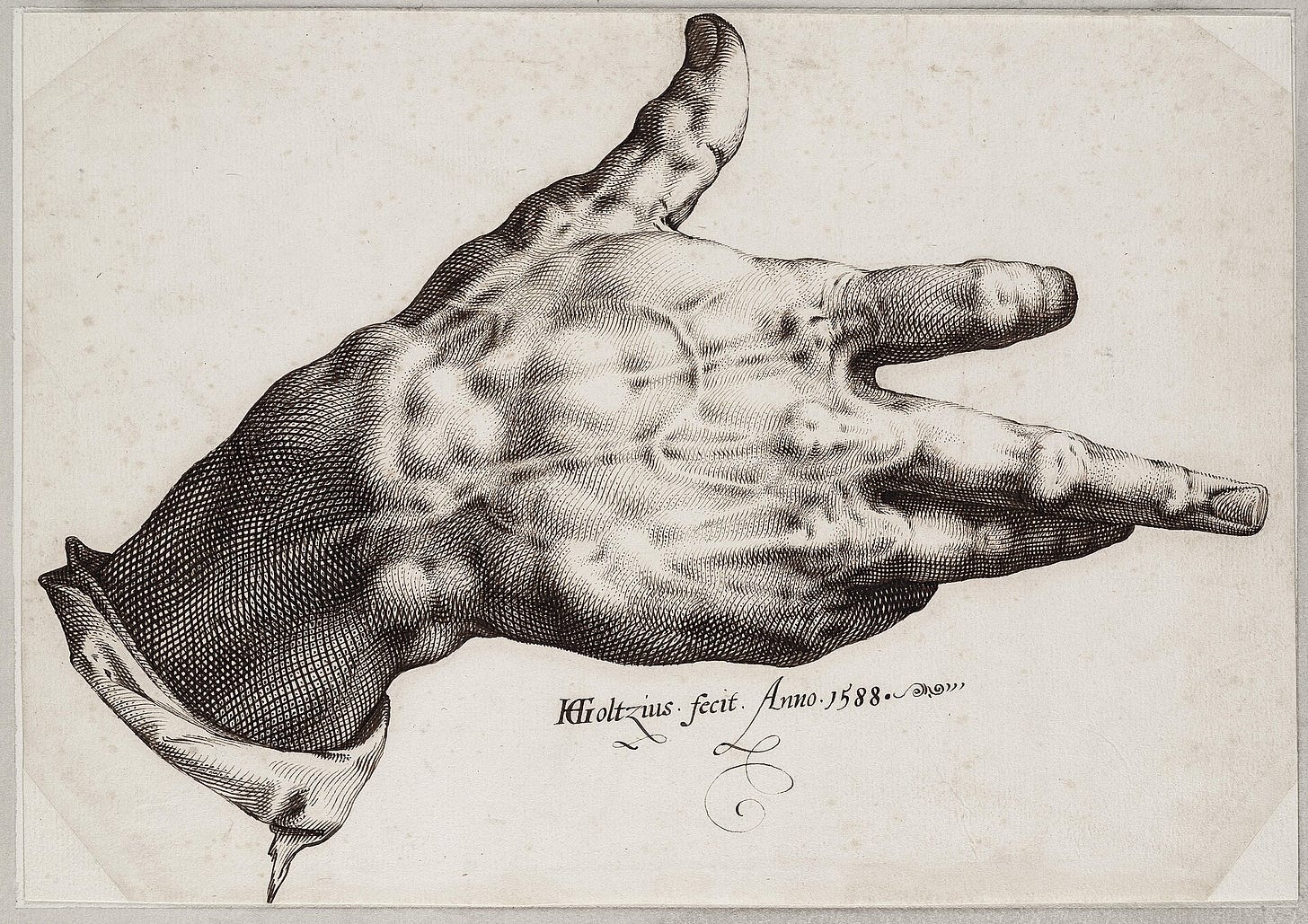 At this point I should mention that Goltzius takes the ‘muscularity’ of the engraving technique and the Mannerist ideal of overcoming difficoltà to the max through his biography. As a very young child he severely burned his hand by falling into his parents’ hearth. The scar tissue fixed his dominant hand like so:2
