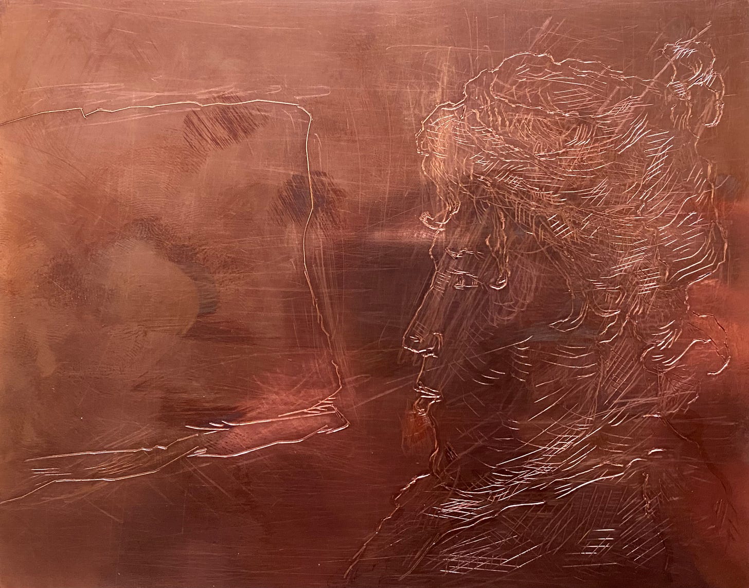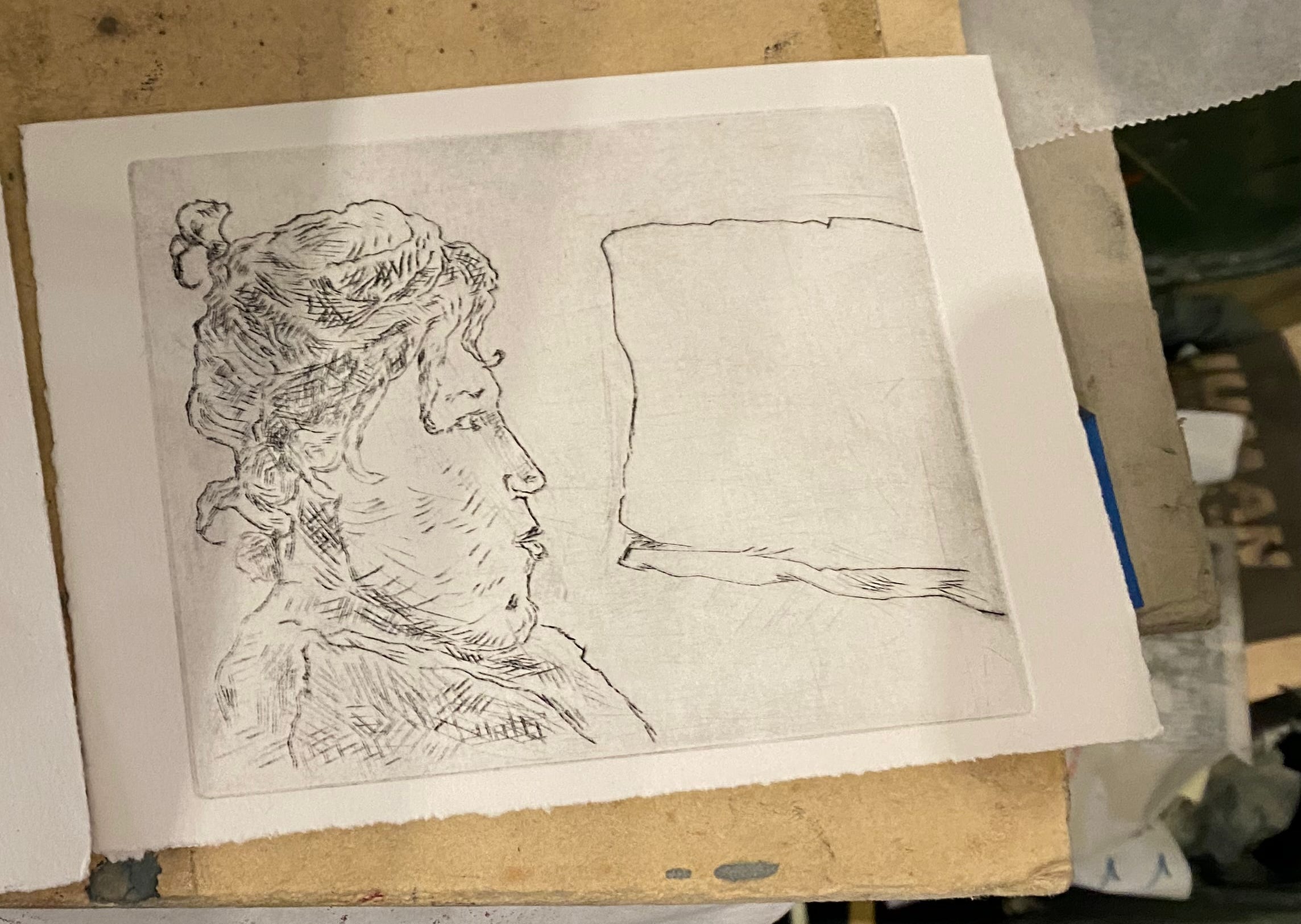 This is where I encountered the ‘slippage’ problem I mentioned in Durer. If you don’t go really deep into the metal, the burin you’re cutting with (also made of metal!) wants to slide across the top of the surface. So you lose control very easily indeed, and make these ultra-straight, light gouges into your printing surface. This can mean anything from giving someone half-meter long eyelashes to looking like they have a nail in their chest. Not ideal.